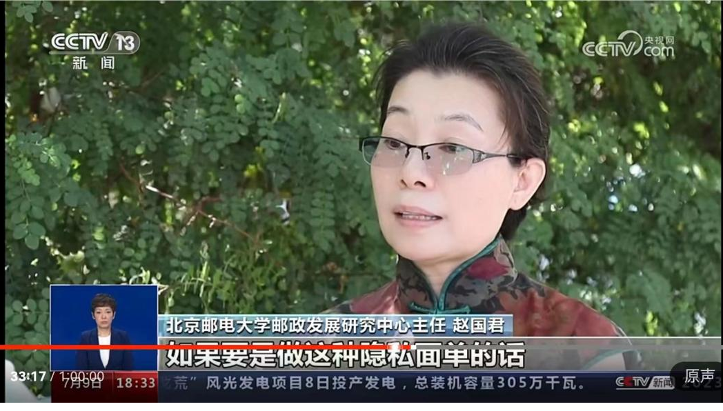 2023年7月9日,就行业隐私面单问题,赵老师接受央视新闻CCTV13采访。央视网“CCTV13 关注·观察:快递单新国标实施三个月,个人信息保护效果如何?‘隐私面单’推进需打通产业链全流程壁垒。”,以及当日晚间新闻也同时播出相关采访内容。