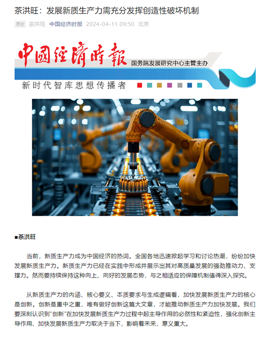 2024年4月11日,由国务院发展研究中心主管主办的《中国经济时报》刊发了冰球突破mg正规官网茶洪旺教授的理论文章《发展新质生产力需充分发挥创造性破坏机制》。