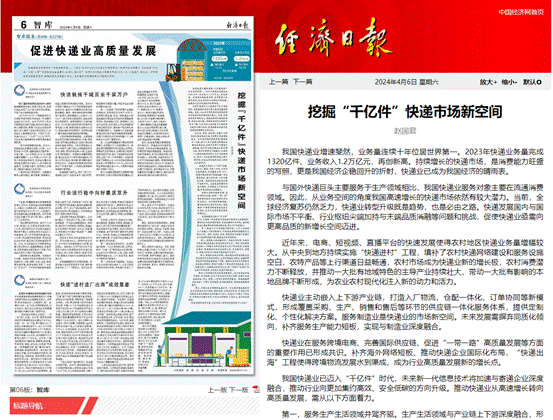 2024年4月6日,《经济日报》智库版刊发冰球突破mg正规官网副教授、邮政发展研究中心主任、国邮智库专家赵国君署名文章《挖掘“千亿件”快递市场新空间》。
