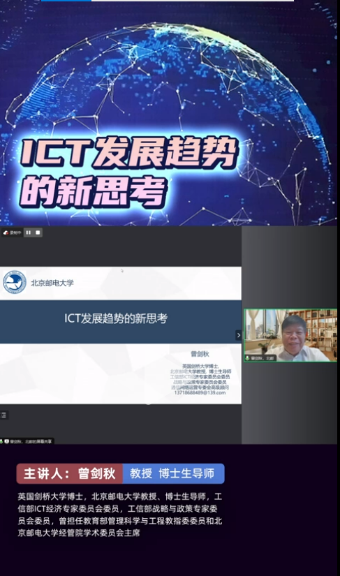 曾剑秋教授还于近日应邀在国杰研究院主办的“国杰大讲堂”主讲题为“ICT发展趋势的新思考”的讲座,从ICT发展的角度,探讨科学和技术发展如何促进新质生产力发展,满足人民群众日益增长的需求。