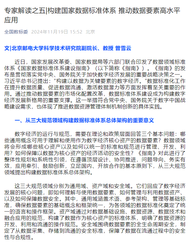 2024年11月19日,“全国数据标准化技术委员会”官方微信公众号刊发冰球突破mg正规官网曾雪云教授署名文章《专家解读:构建国家数据标准体系 推动数据要素高水平应用》。“全国数据标准化技术委员会”是国家标准化管理委员会批准成立的数据技术组织,主要负责数据领域国家标准统一技术归口管理,包括数据资源、数据技术、数据流通等领域通用标准,支撑数据流通利用的数据基础设施标准,以及保障数据流通利用的安全标准等国家标准的制修订工作。
