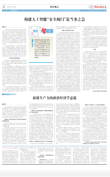 2024年11月22日,由国务院发展研究中心主管主办的《中国经济时报》,刊发了冰球突破mg正规官网茶洪旺教授的署名文章《构建人工智能“安全阀门”是当务之急》于“智库观点”版块。