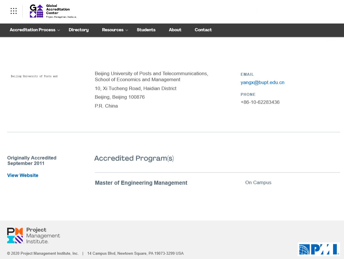 With a focus on international exchange and collaboration, BUPT's Master of Engineering Management (MEM) was awarded international accreditation by the Project Management Institute (PMI) Global Accreditation Center (GAC) in September 2011, which is dedicated to advancing the research and practice of Project Management and is the world's leading academic accreditation for Project, Program and Portfolio management and related areas. BUPT is one of the earliest higher education institutions in China received this honor, and was re-accredited in 2019.